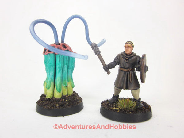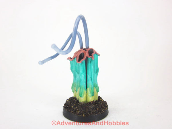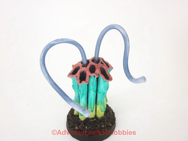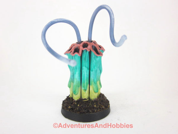 Description: The alien landscape is filled with a bewildering range of colors not common on Earth. Hidden amongst the vibrant display, a hunter waits for its next meal to come too close. Strong tentacles whip out of the creature's central stalk, ensnaring its victim. The tentacles are strong enough to crush most prey and work together to literally tear apart the unlucky victim. The bits torn into smaller pieces are conveyed to the multiple mouths atop the creature.